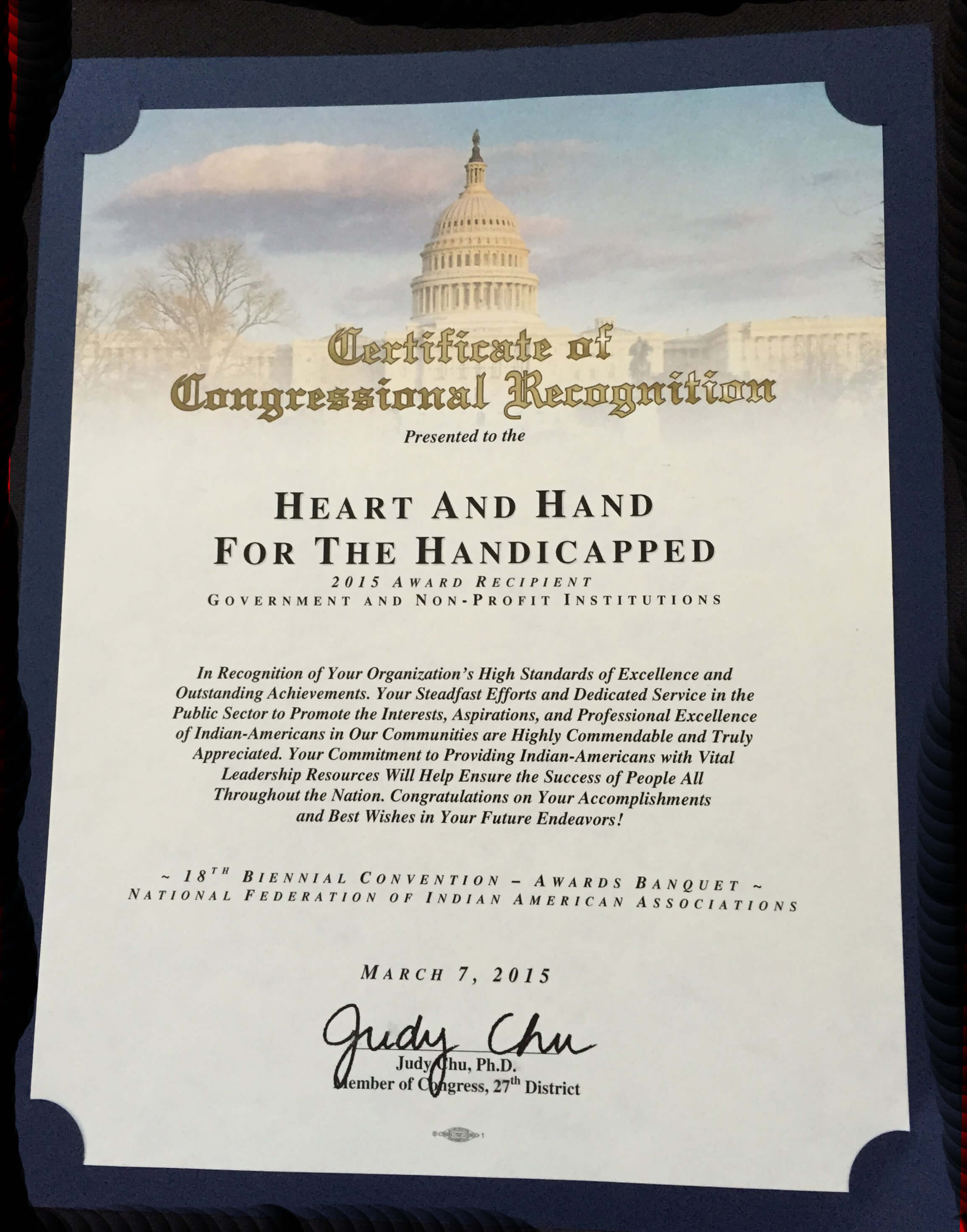 Heart and Hand for the Handicapped (HHH) is a not-for-profit tax-exempt 501(c) (3) organization that raises funds to support differently abled children with physical and mental challenges such as polio, cerebral palsy, autism, Down's syndrome, and blindness and other vision problems in India and the US. HHH was founded in 1971 by five South Asian ladies who wanted to make a difference in the lives of differently abled children in India.